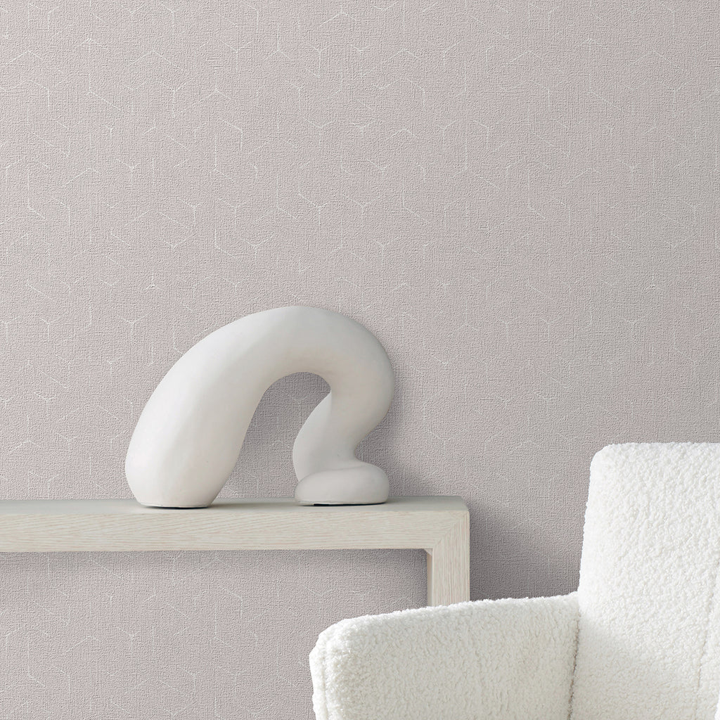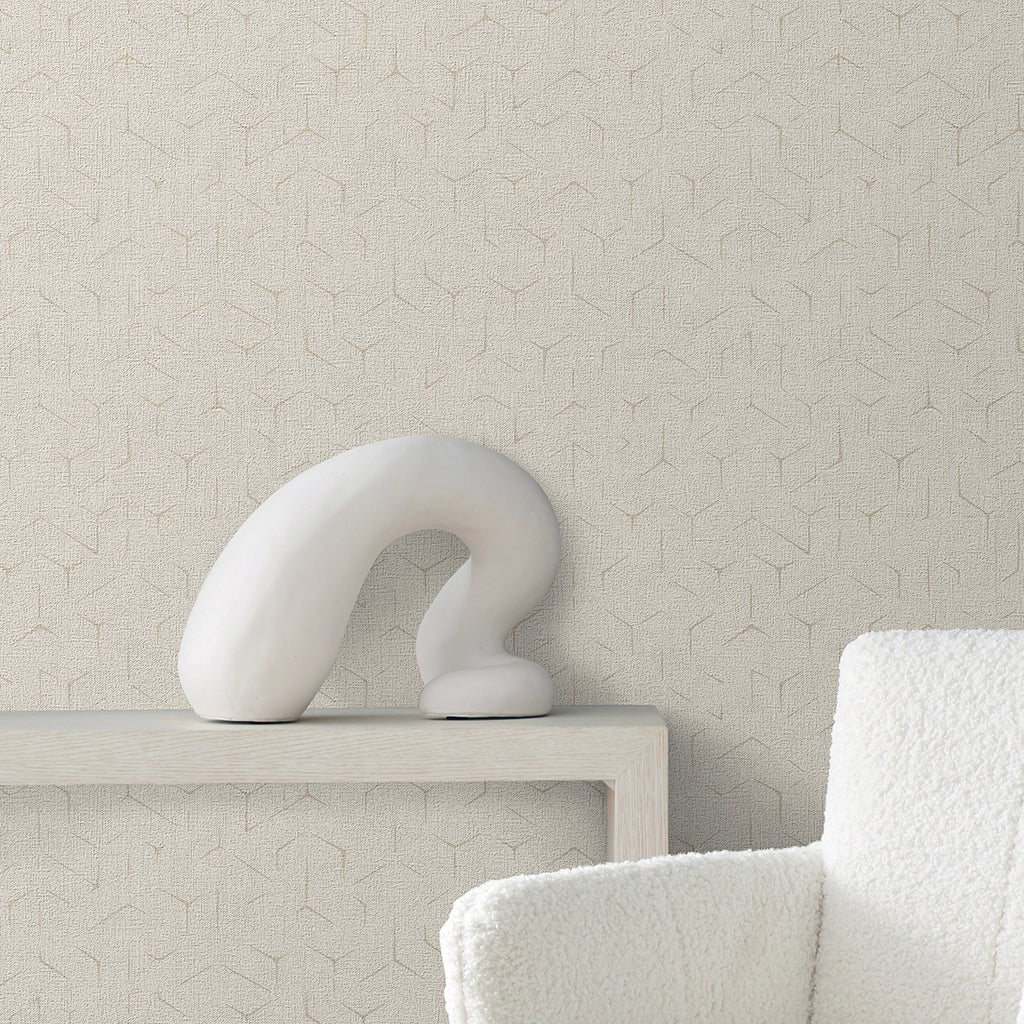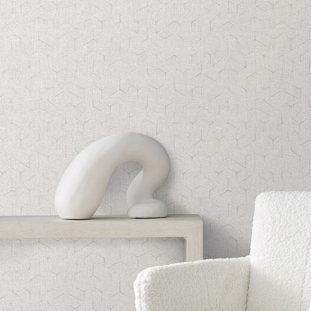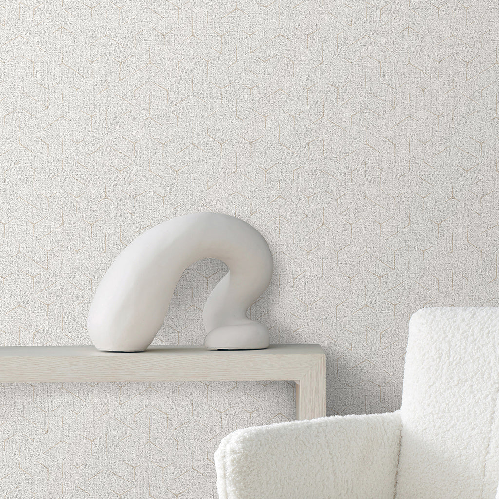 The palette's texture of breezy coastal linen balances the clean edges of a deconstructed hexagonal geometric. Rendered in either a matte finish, or with hints of glamorous metallic, contemporary aesthetics incorporate affluence and a casual expectation of luxury.